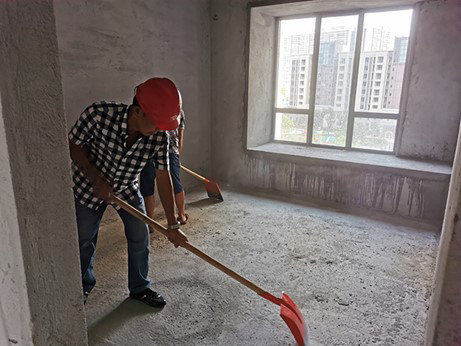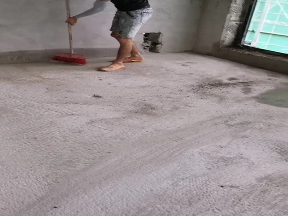 2、把步骤1铲出来的灰渣清扫干净并清除现场,楼板地面检查基面有无油污,无蜡质物体,无松动的灰渣,无凸出于地面的钢筋、铁钉,无浮尘,避免喷涂途中因灰尘过多,涂料喷涂完毕后可能会引起掉粉或脱落,如下图所示: