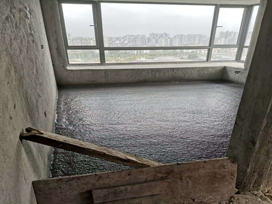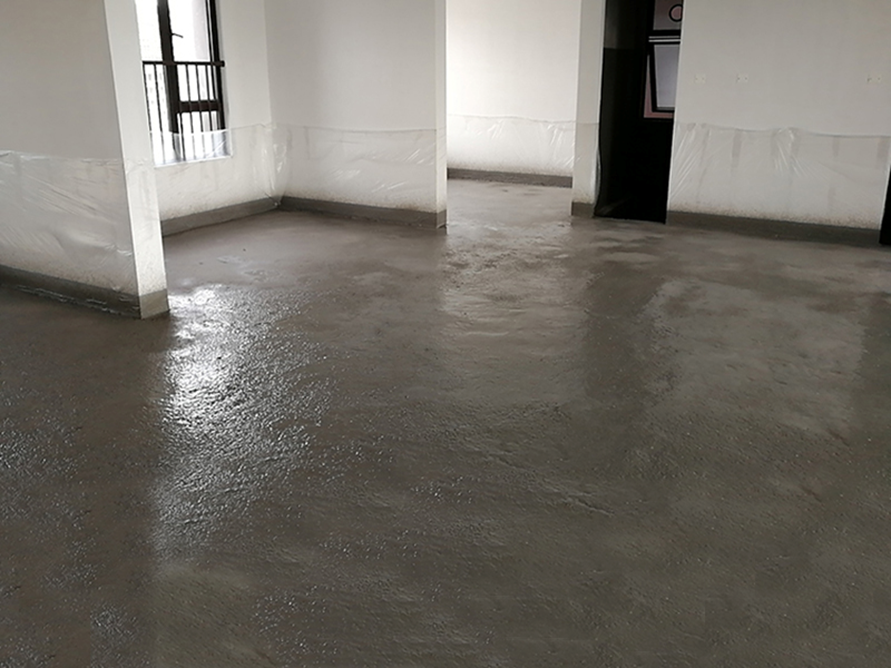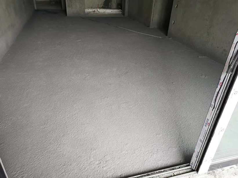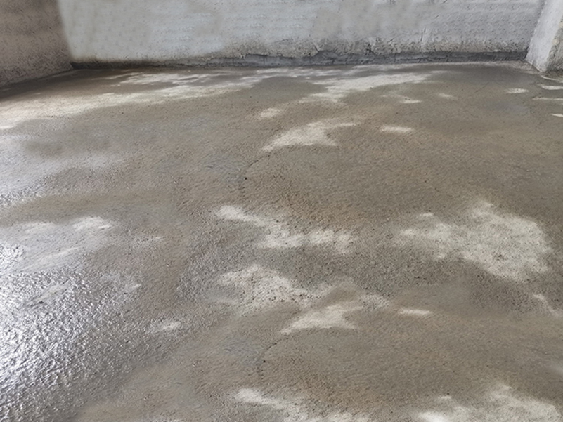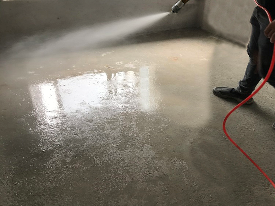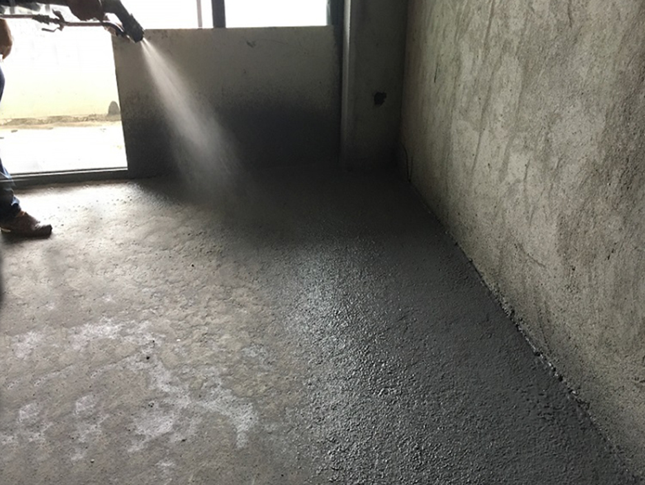 3、可以适当轻微洒水湿润楼板地面,一般地板面洒水后,尤其应注意不能有漏水积水或者非常潮湿的地方,有的地面要充分湿润后,待楼板地面表面要微微干爽,不能全干透,才适合喷涂施工,只有这样涂料与众多复合基材相容性好,否则由于地面太干燥,会引起气泡、气孔现象,而且涂料干透后不开裂不空鼓,如下图所示: