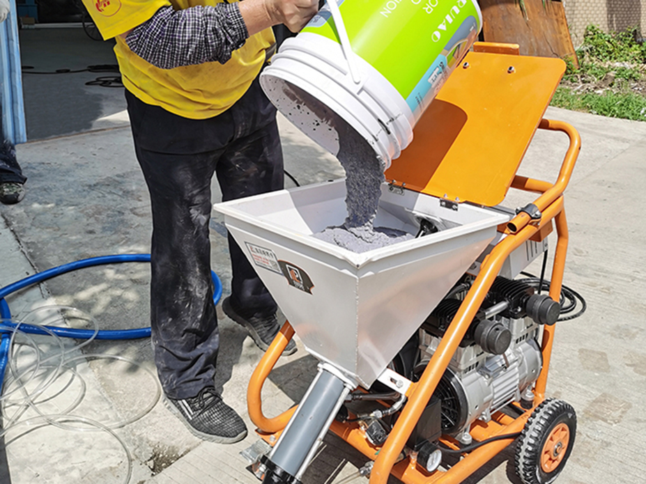 5、如果是在地面施工,也可以抹涂或刮涂,但建议喷涂,相对抹涂或喷涂来说,喷涂更为简单方便,把搅拌均匀的涂料倒入喷涂机的料斗就可以开始喷涂。