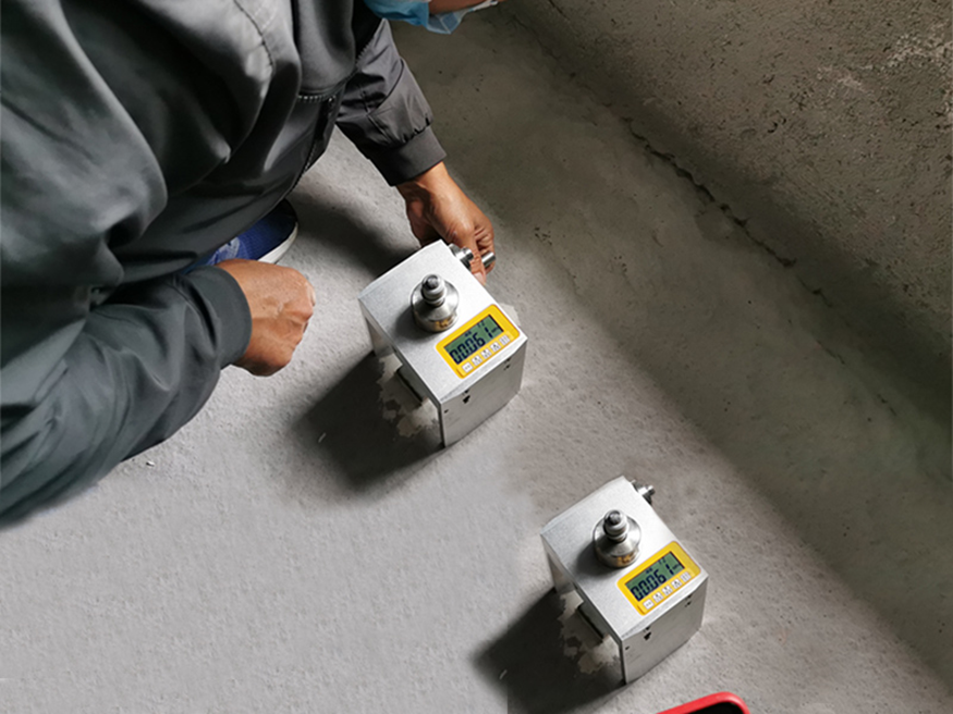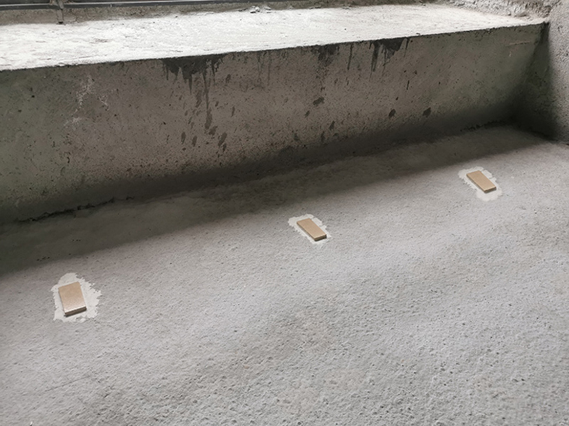 8、楼板地面隔音涂料施工喷涂完成后,工人们商量方案检测涂料地面成品做附着力(抗拉拨)测试,结果表明涂料与地面的粘结强度≥0.25/Mpa达到行业标准,就可以直接铺砖了,如下图所示: